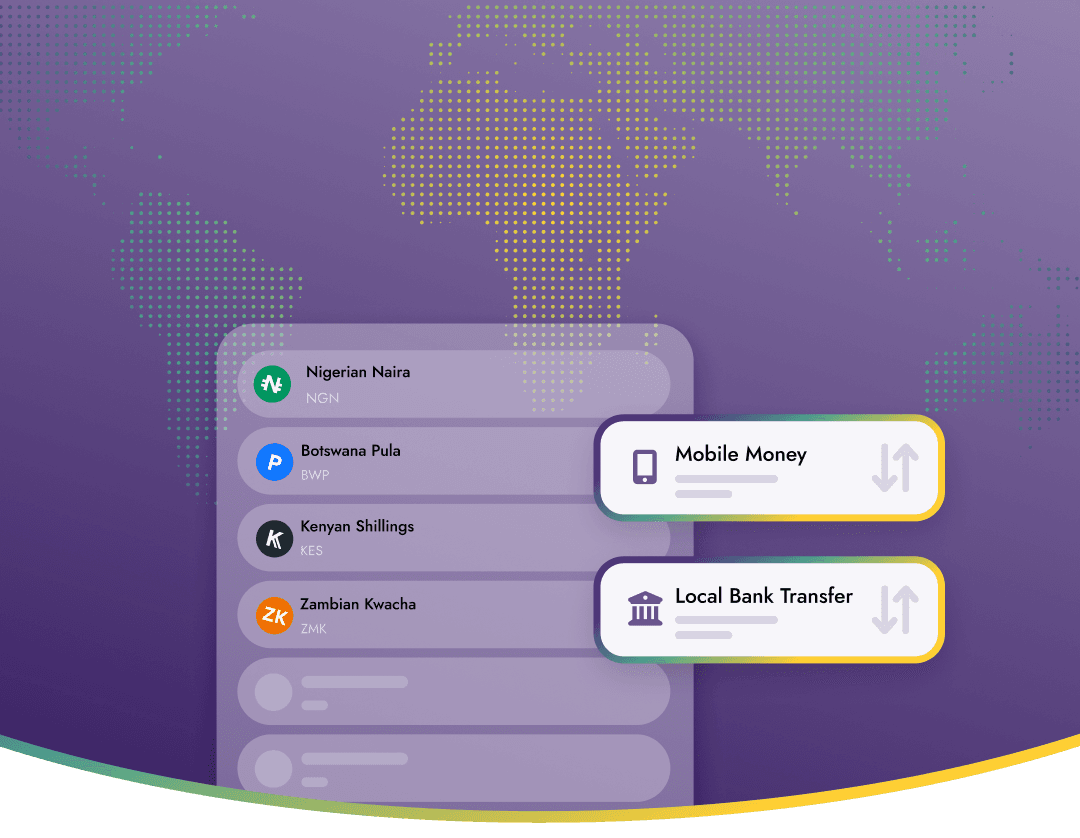 Whether you’re collecting local currency for purchases, or disbursing for payouts, our API gives you access to over 20 African currencies.
